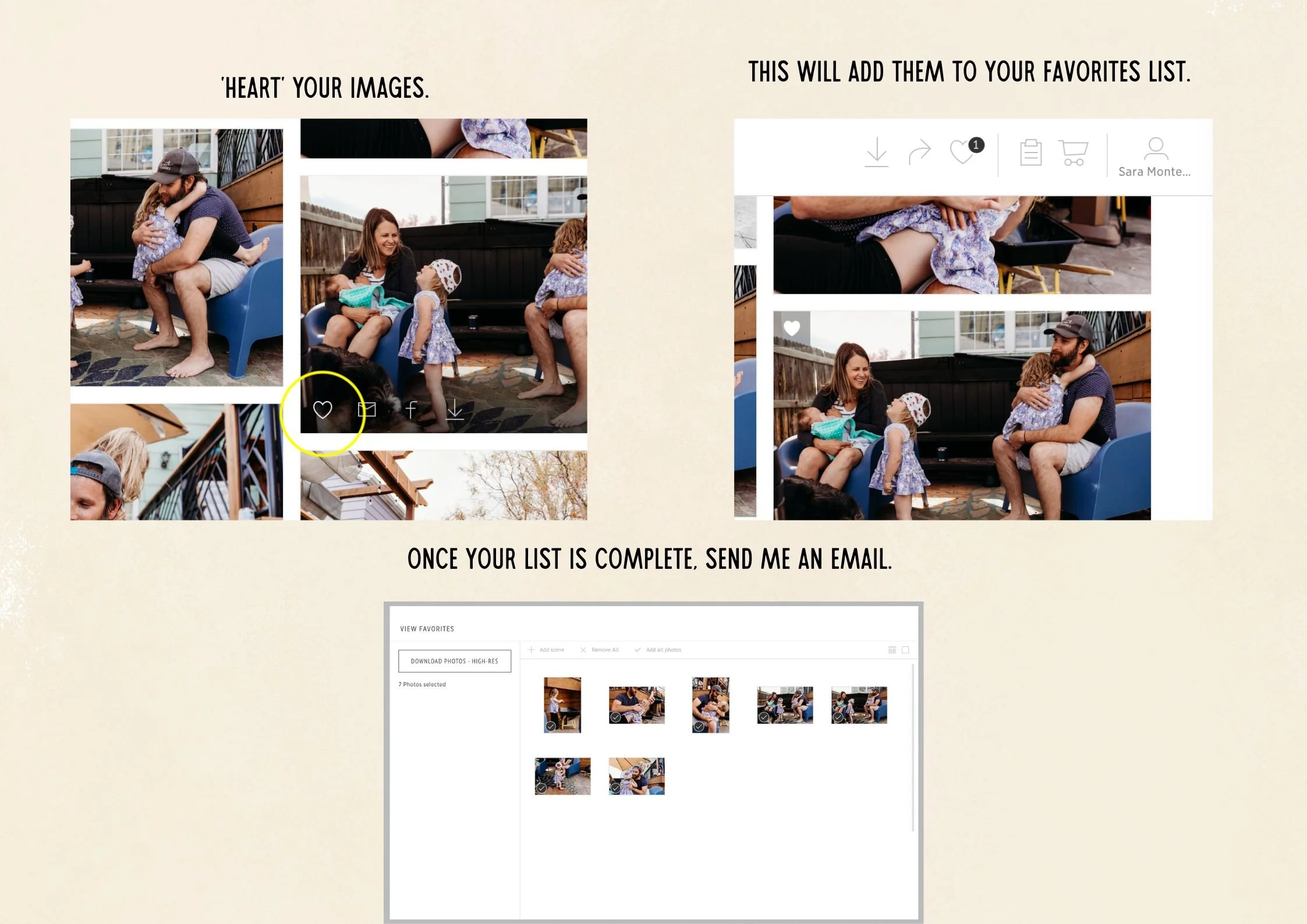 To do this, go your gallery on Pic-Time and ‘heart’ your favorite images. This will create a favorites list I can work from.